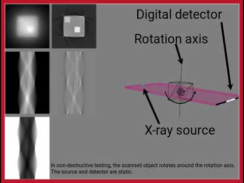A tomography acquisition is simulated in real-time using a step wedge. The reconstruction is also performed in real-time using the simple back-projection (same as filtered back-projection, but without filtering).