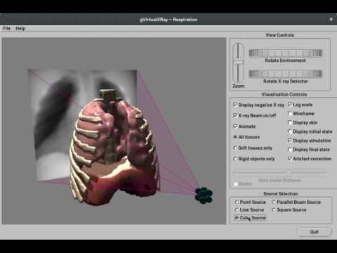 Real-time simulation of X-ray images with a virtual patient that can breath. Contributors include P.-F. Villard (Lori/Inria/Univ of Lorraine), A. Meuleman and F. P. Vidal (Bangor University) for the procedural texturing, and X-ray simulation.